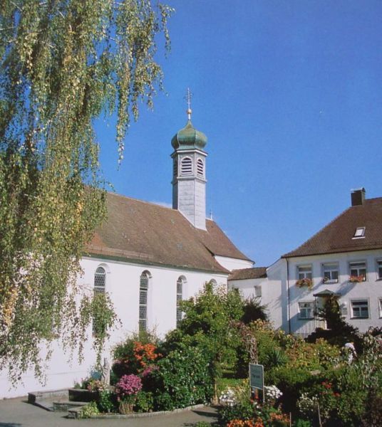 Das Stifterehepaaar Graf Ernst von Monfort und seine Gemahlin Gräfin Antonie von Waldburg und Scheer-Dürmetingen ließen sich in den Seitenaltarbildern der Heiligen Barbara und Eustachius porträtieren.